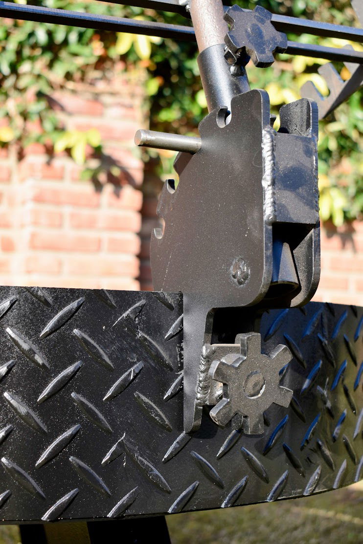 Con este fogonero asador podés cocinar a la estaca y a la parrilla. La estaca tipo "prensa", está montada en un soporte que le posibilita una regulación angular de 5 posiciones, para optimizar la cocción. La media parrilla te permite asar de forma tradicional.